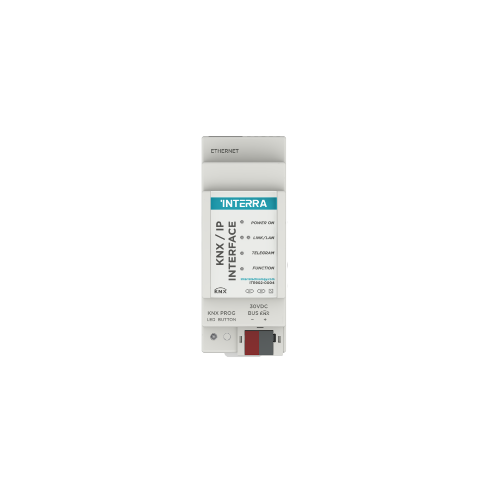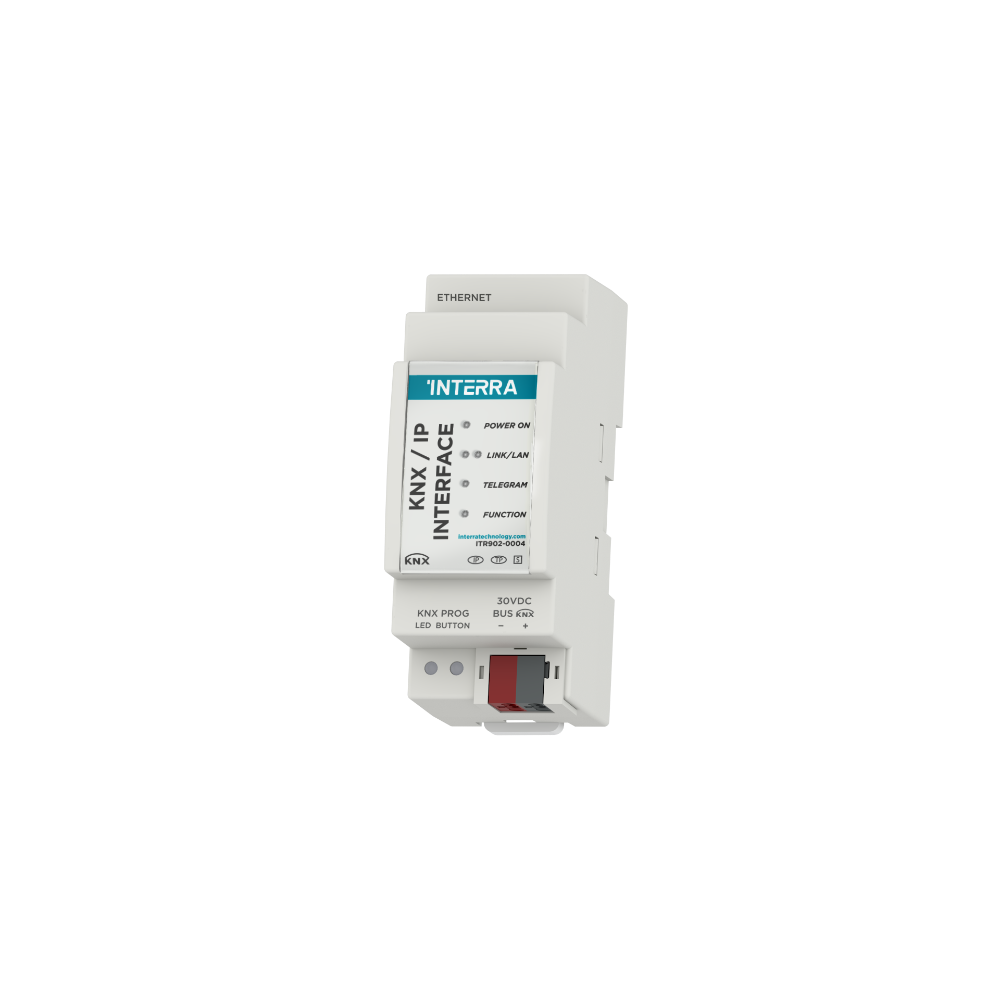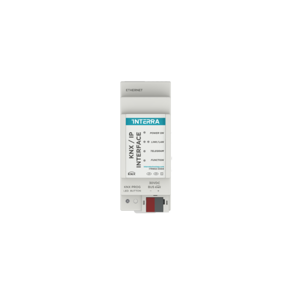 Interra KNX IP Interface serves as a universal interface for devices at the IP layer to access the KNX bus line. The KNX bus line can be accessed from any point on the LAN. It can be used as a programming interface for ETS® from ETS 3.0f onwards. However, a maximum of 5 simultaneous connections are possible for access via KNXnet/IP Tunneling. Additionally, the IP address can be obtained via a DHCP server or manual configuration (ETS), respectively. The energy required to operate the device is provided via KNX line.