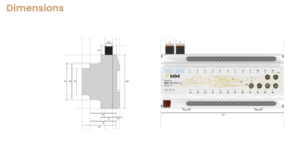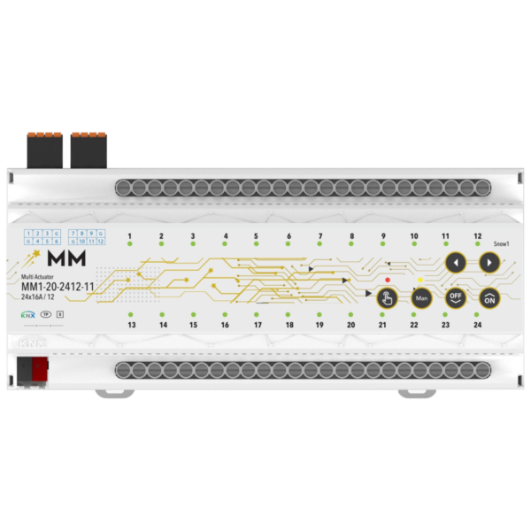 MM1-20-2412-11 is a KNX compatible automation device that offers different usage purposes together. Manages lighting, shutter/blinds, fancoil, water, electricity and energy control like a Maesto.