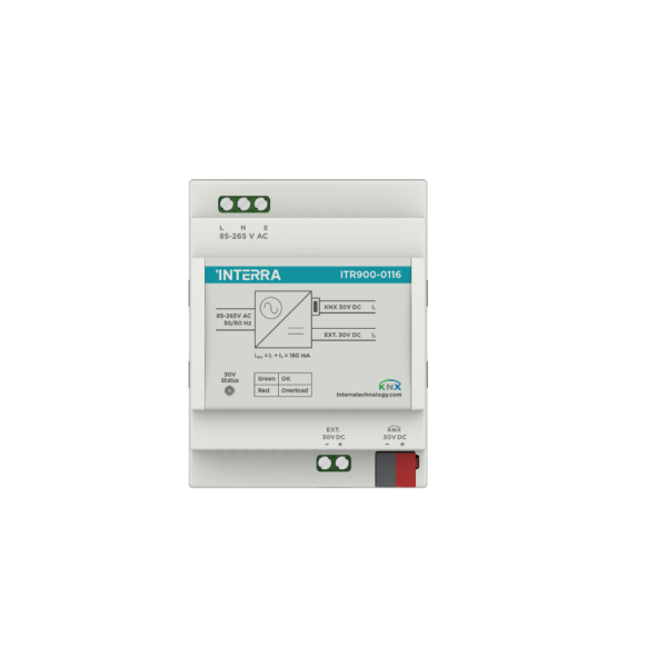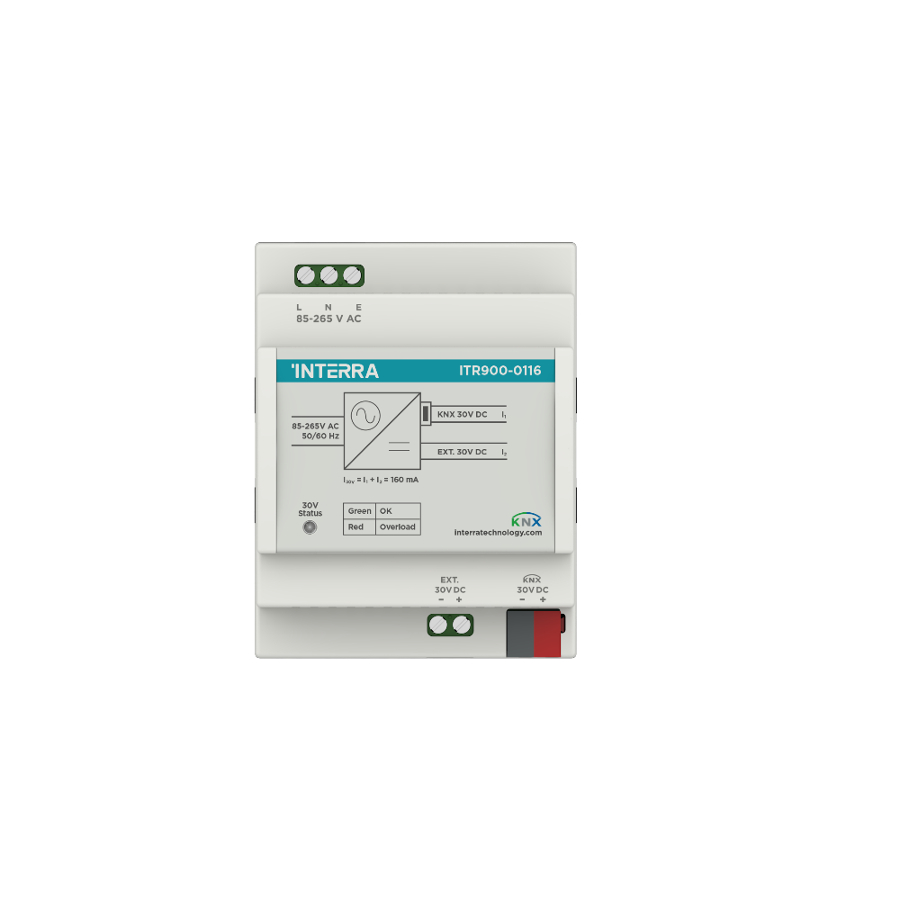Interra 160 mA KNX Power Supplies generate and monitor the voltage (SELV) for KNX devices connected to the line. They feature a 160 mA bus load with an integrated choke and wide-range mains input for worldwide use. The bus line is isolated from the power supply by an integrated choke. Voltage output is short circuit and overload protected. Two color LEDs (Green and Red) indicate device output status. It has a wide input range from 85…265 V AC to 50/60 Hz.