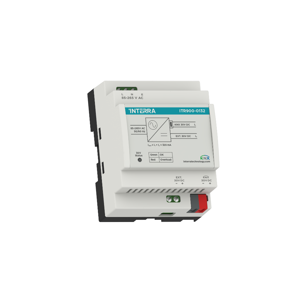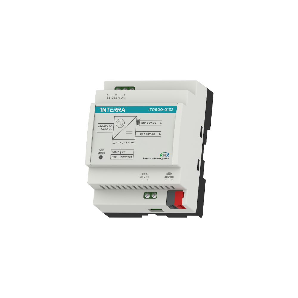 Interra 320 mA KNX Power Supplies generate and monitor the voltage (SELV) for KNX devices connected to the line. They feature a 320 mA bus load with an integrated choke and wide-range mains input for worldwide use. The bus line is isolated from the power supply by an integrated choke. Voltage output is short circuit and overload protected. Two color LEDs (Green and Red) indicate device output status. It has a wide input range from 85…265 V AC to 50/60 Hz.