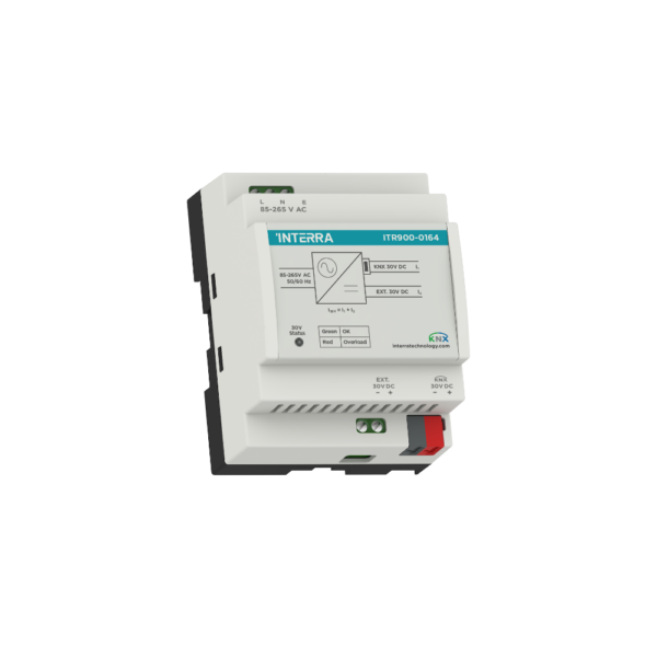 Interra 640 mA KNX Power Supplies generate and monitor the voltage (SELV) for KNX devices connected to the line. They feature a 640 mA bus load with an integrated choke and wide-range mains input for worldwide use. The bus line is isolated from the power supply by an integrated choke. Voltage output is short circuit and overload protected. Two color LEDs (Green and Red) indicate device output status. It has a wide input range from 85…265 V AC to 50/60 Hz.