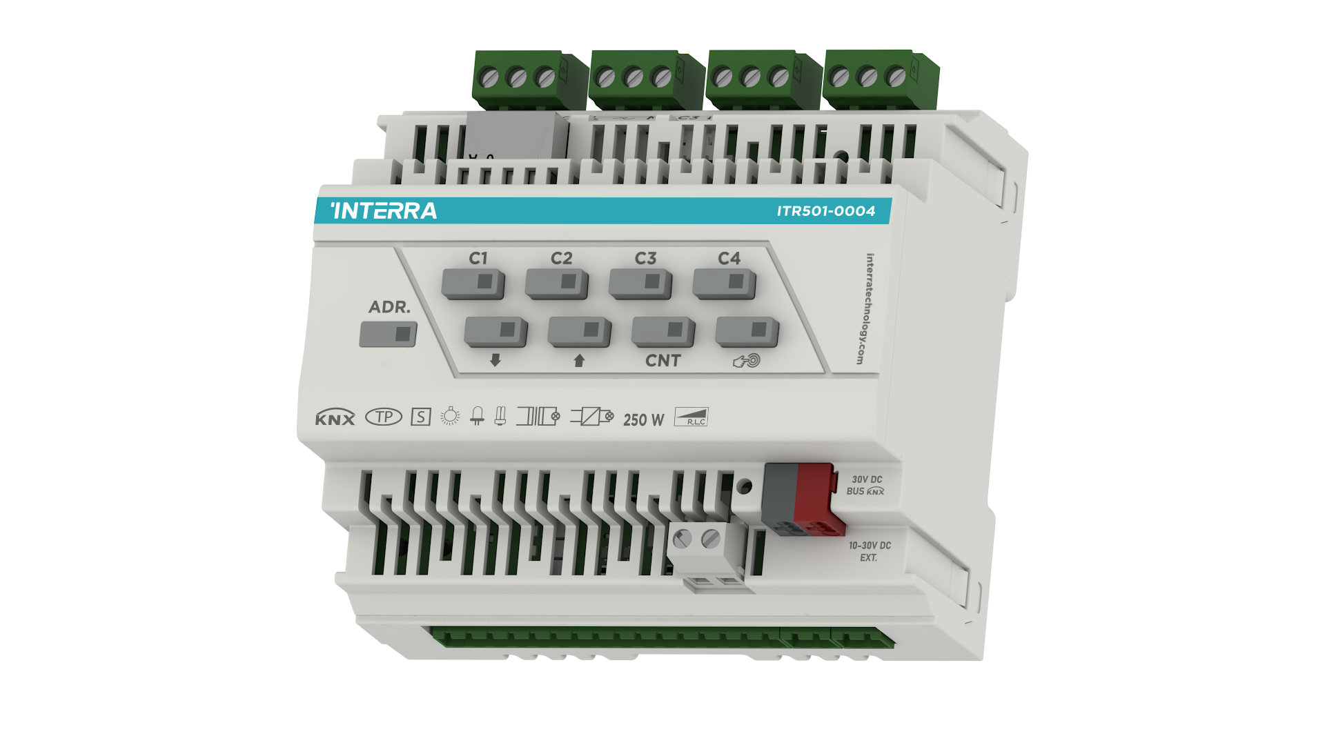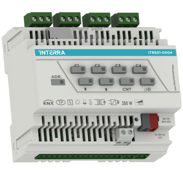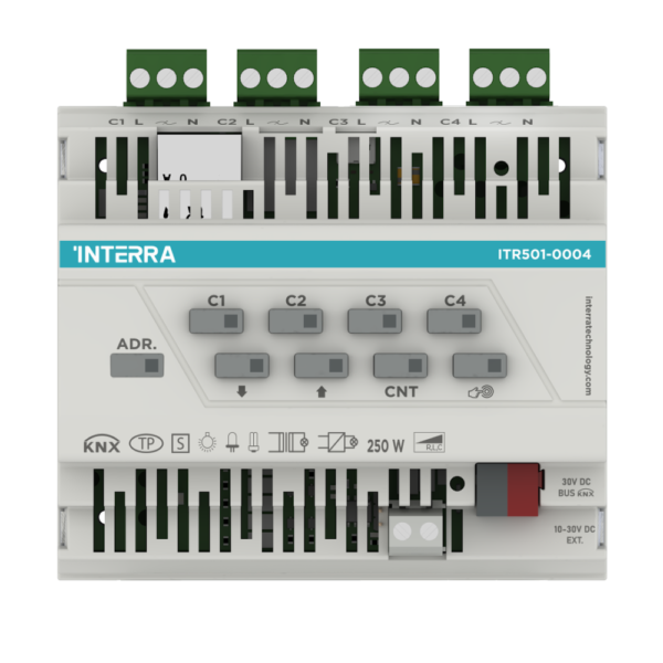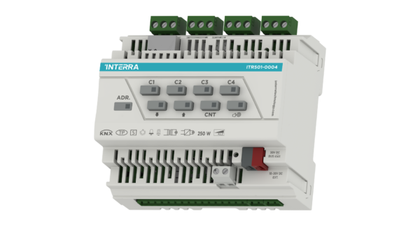 Interra 4 Channel Universal Dimming Actuator can produce 250 W output power from each channel and drive R, L and C loads. Temperature protection, short circuit protection, error notification via channel LEDs, load presence detection and load type detection features are available. It is possible to program the device without applying 230 V supply voltage.