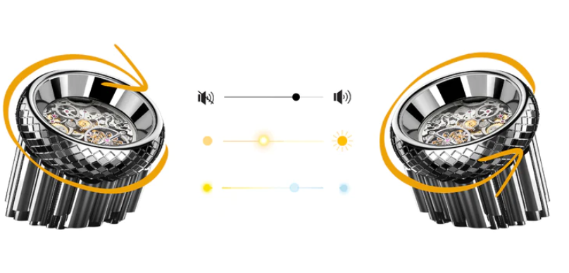 Control all 0 – 100% devices such as lights, temperature of light, sound of music, etc. by rotating the outer rim of the dimming knob, or slide on the screen.