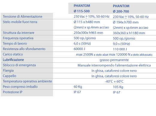 The PHANTOM 230 Vac electromechanical bollard is suitable for installations in spaces for collective use, lubricated with permanent grease and equipped with a servomotor. The Ø115-500 version is particularly suitable for installations in private contexts, such as private entrances and homes, garages, etc. etc. The Ø200-700 version is suitable, however, for contexts such as condominiums, hotels, private companies, etc. etc.