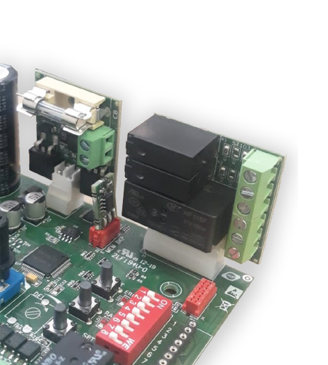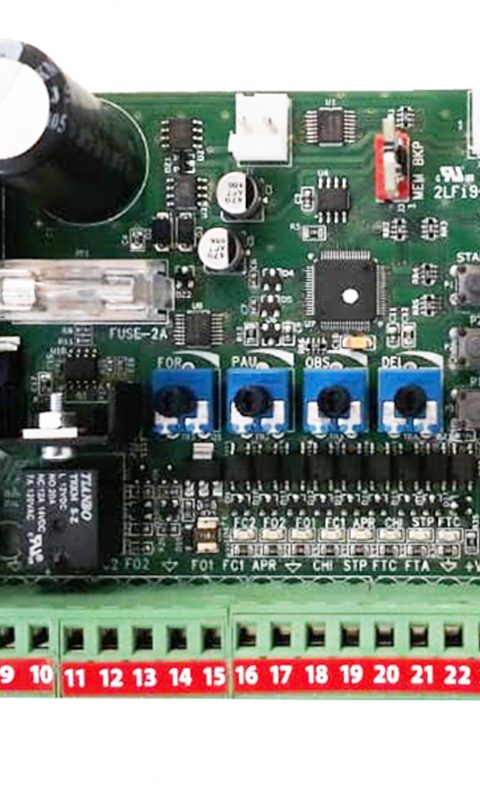 Microprocessor control unit for sectional, overhead doors and 24 V barriers with amperometric regulation, fully automatic or professional programming of working times and deceleration, backup memory and light card